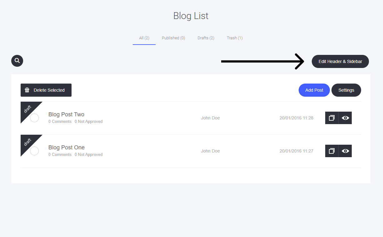This will open the drag-and-drop editor, where you can edit the blog header section and the sidebar (if you choose to use a sidebar).