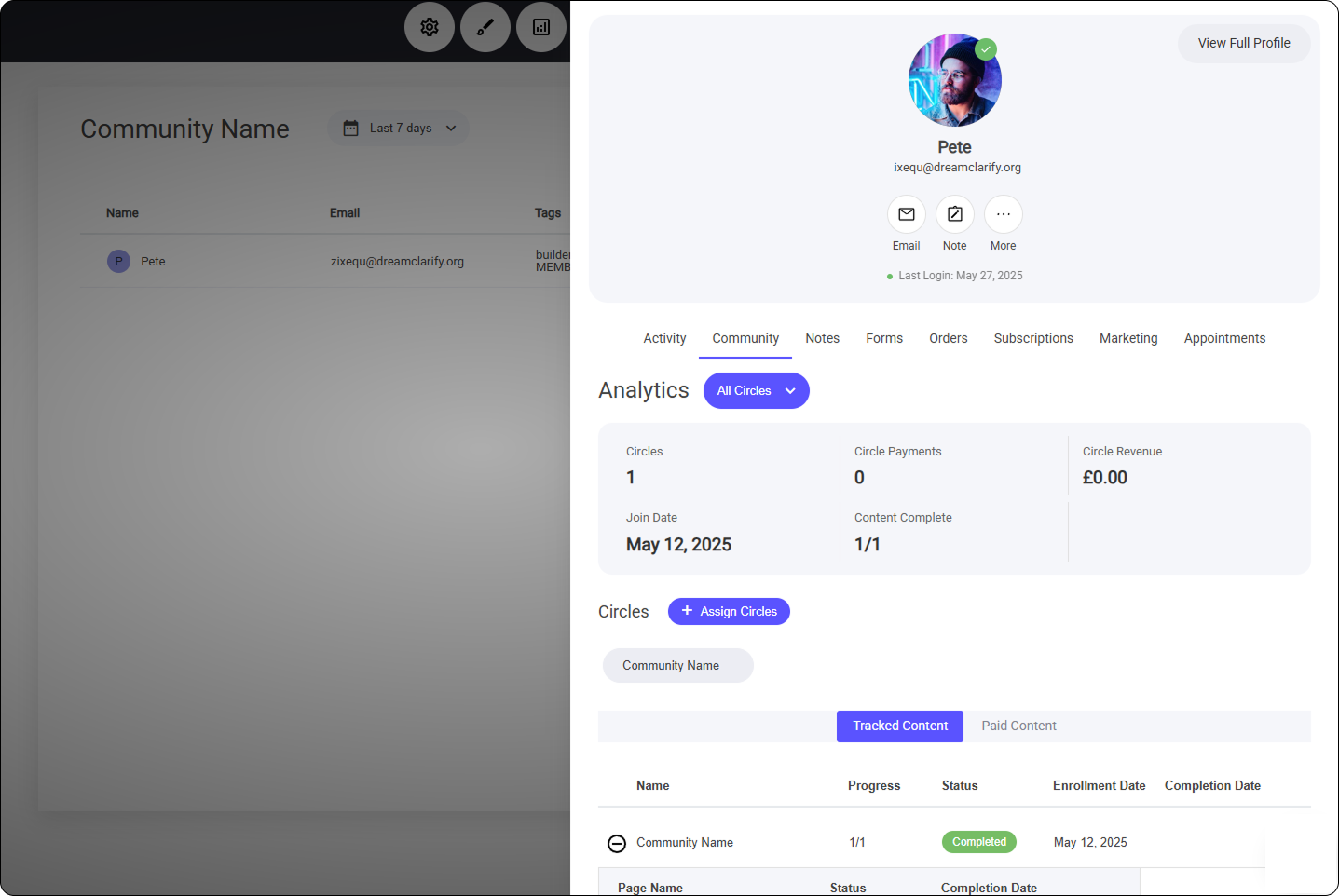 Once you select a member from the list, you’ll gain access to a detailed profile view, providing valuable insights into their engagement and activity within your Circle.