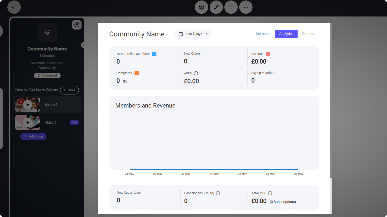 When you click the Analytics tab at the top, a pop-out screen will appear, giving you easy access to all analytics and engagement insights. Within this screen, you can explore different sections, allowing you to track community activity, member interactions, and financial metrics.