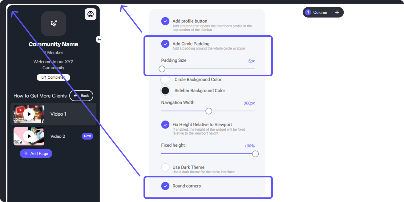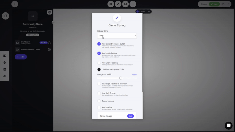 For a sleek, modern feel, you can also round out the corners, perfect for brands that favor a softer, refined aesthetic. Additionally, you have the flexibility to customize background colors, including the sidebar background, or even switch your Circle into dark mode for a more immersive experience.