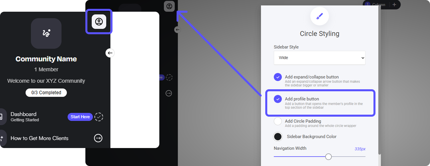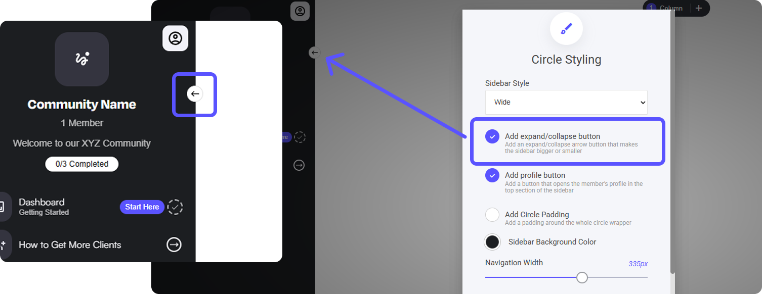 This setting allows you to enable or disable the small arrow icon that controls the Sidebar navigation. When activated, this icon lets users expand the Sidebar to its full width or collapse it into a more compact view. This provides flexibility, ensuring members can choose between a detailed navigation experience or a cleaner, space-saving layout.