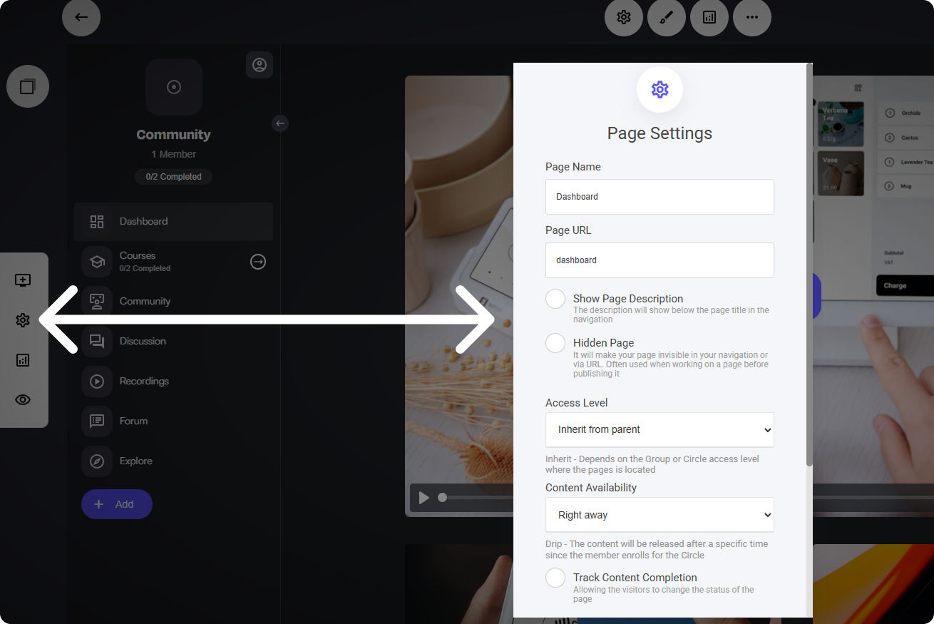 Page level settings enable you to quickly edit things like, access levels, Content availability and more. To access the page level settings, simply select the gear icon to the left: