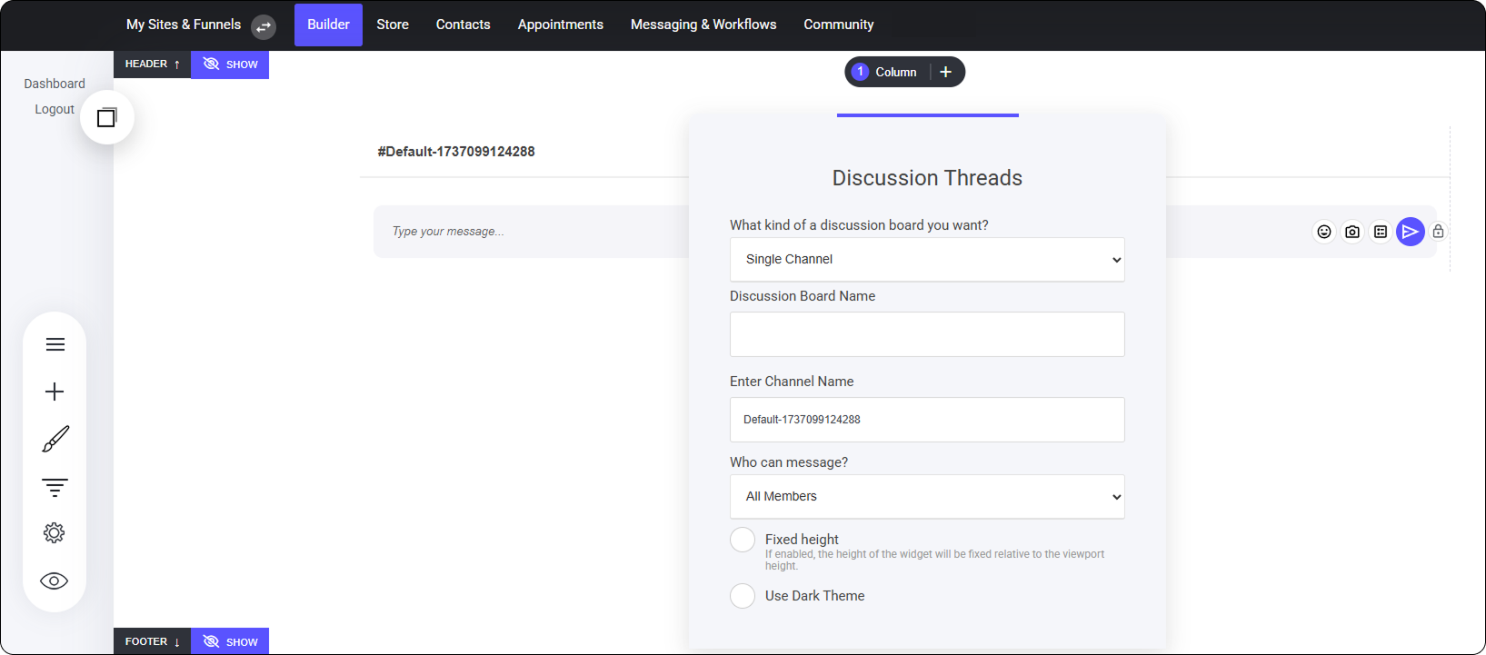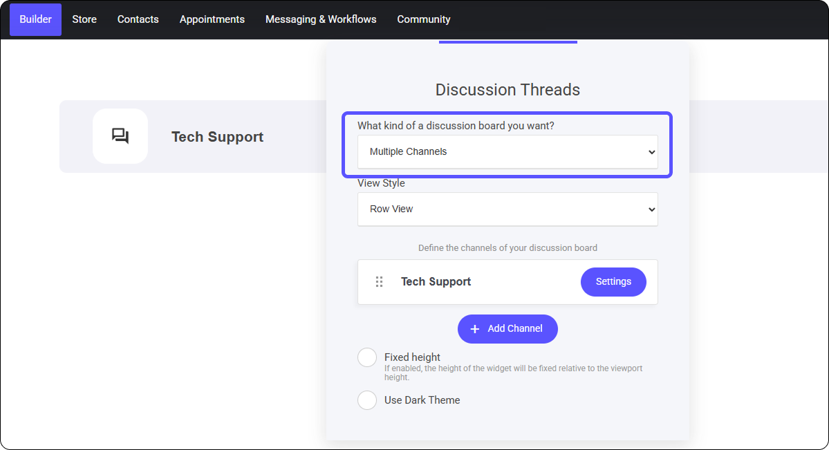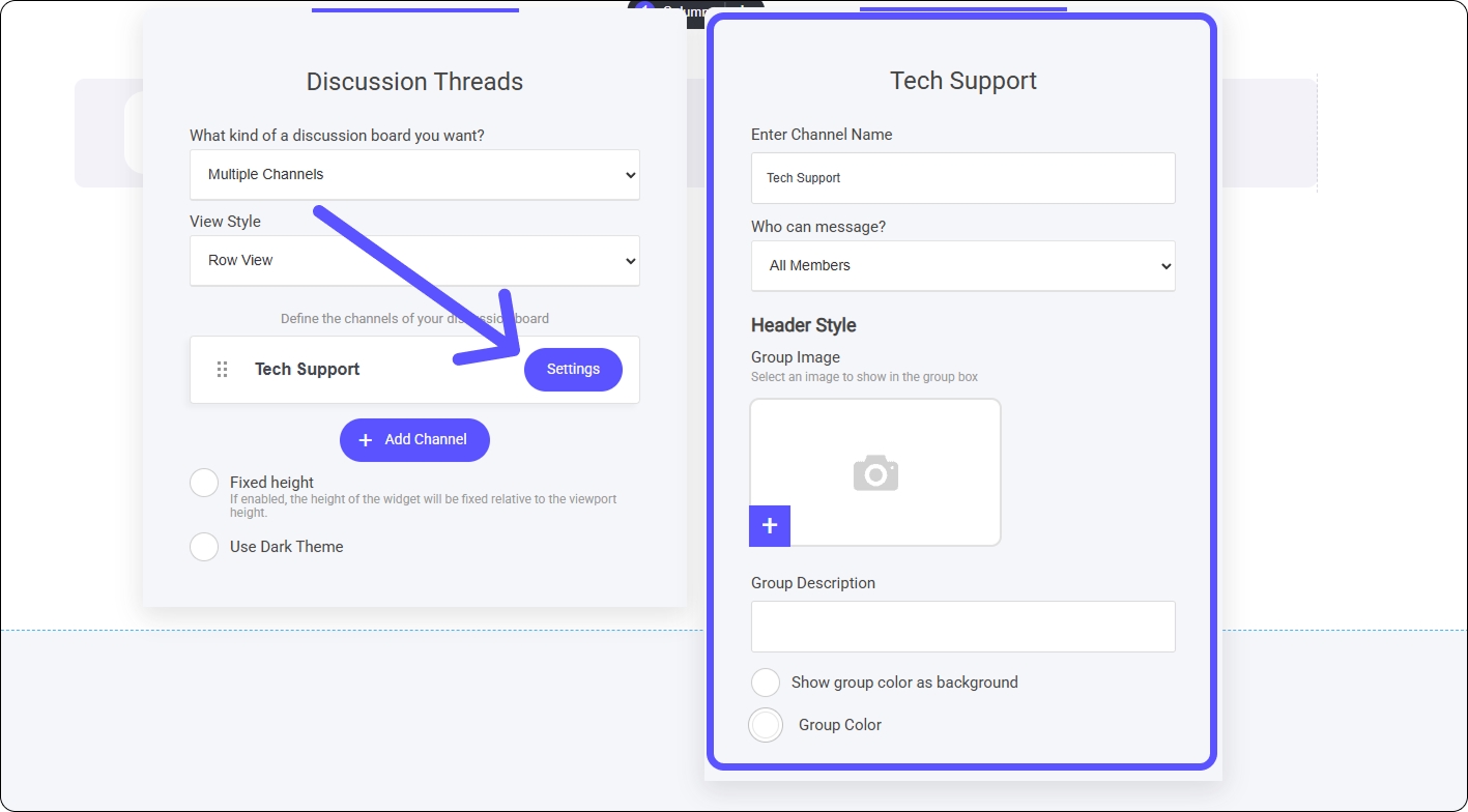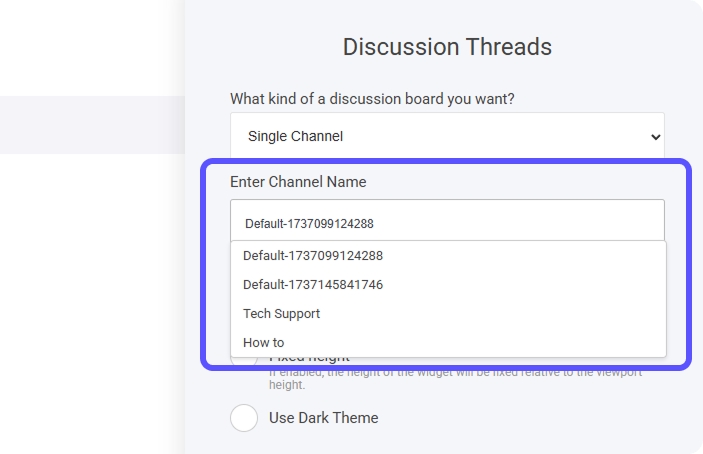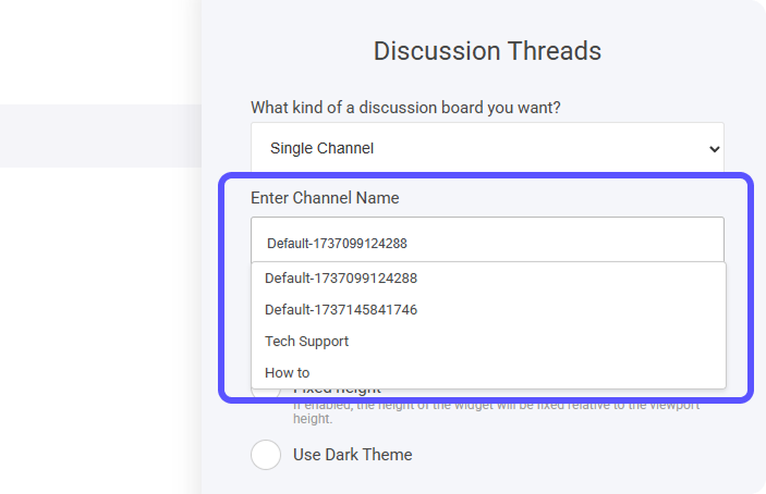 When configuring your Discussion Widget, you can choose between displaying a single channel or multiple discussion threads.