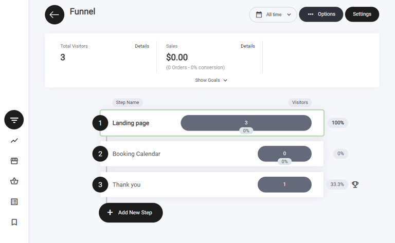 Note: To the right of the funnel step you will see a trophy icon. This denotes a funnel step goal. For example, Once the visitor has taken action on the landing page. They have hit a goal. You can see all goals within the funnel analytics tab.
