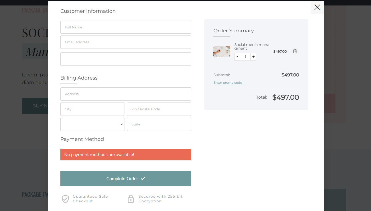 Once the visitor has clicked on any button or filled out the form widget on the landing page, the next step in the funnel is the order page where your product/s are displayed.​