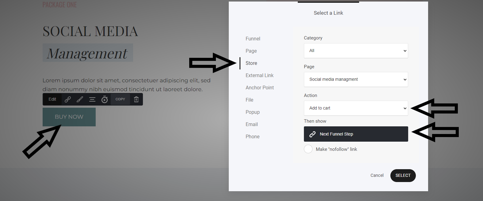 Note in this funnel we are using a button to add the product directly to the cart and takes them straight to the checkout with the item already added.
