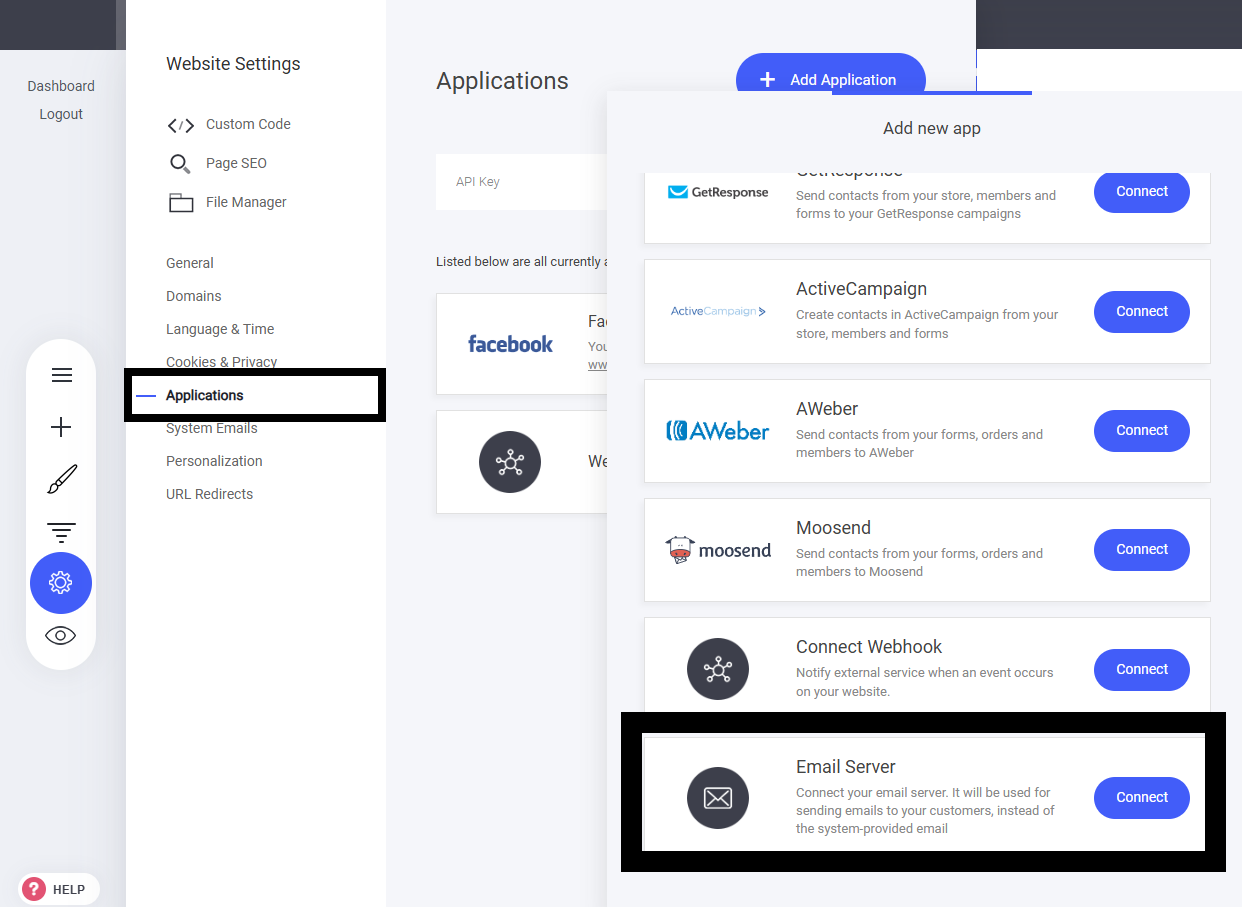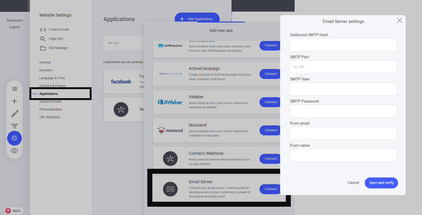 To enable email sending from your custom domain, you need to connect an SMTP server to your website.