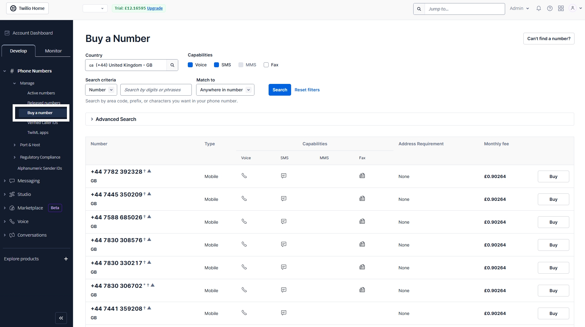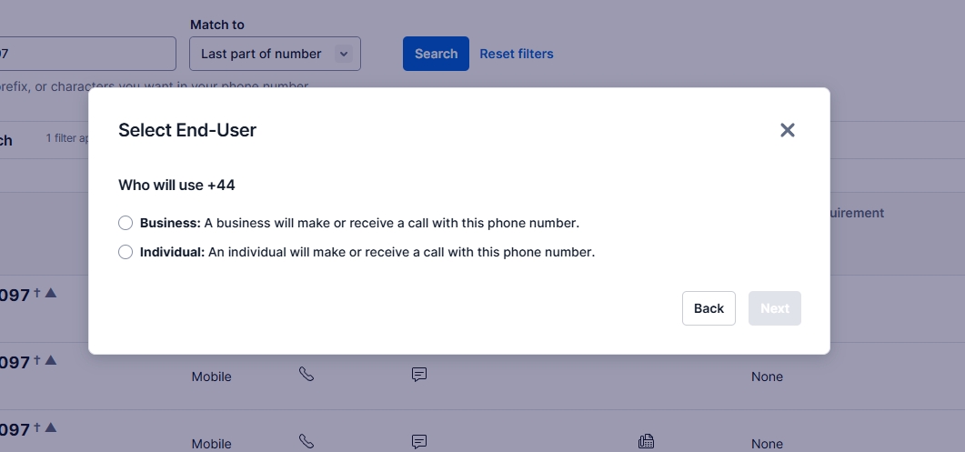 Here, you can select the country you want to register the number in. There are standard filters that allow you to type in numbers you'd like to include within the number itself. You can also refine the filter using the 'Advanced Search' to get a more localized number if you prefer, such as one based on your city.