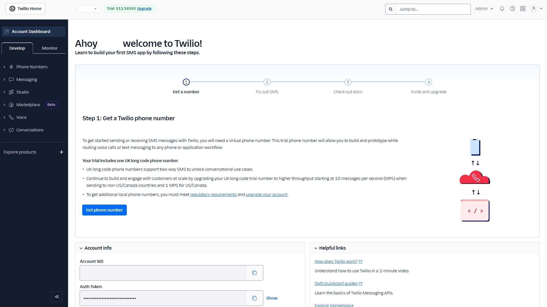 Once you have registered for a Twilio account you will be directed to the Twilio main dashboard as shown below.