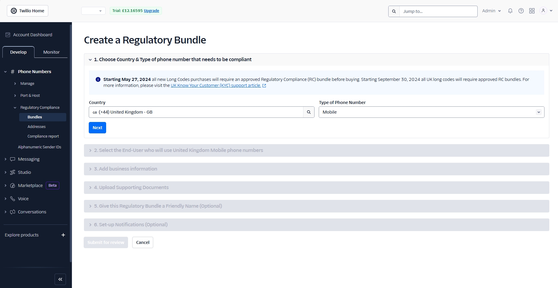 To create a bundle within Twilio, navigate to the main dashboard > Regulatory Compliance > Bundles