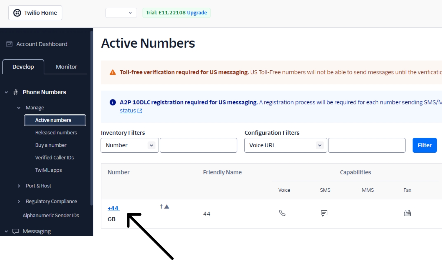 First, navigate to the main Twilio dashboard > Phone numbers > Manage > Active numbers