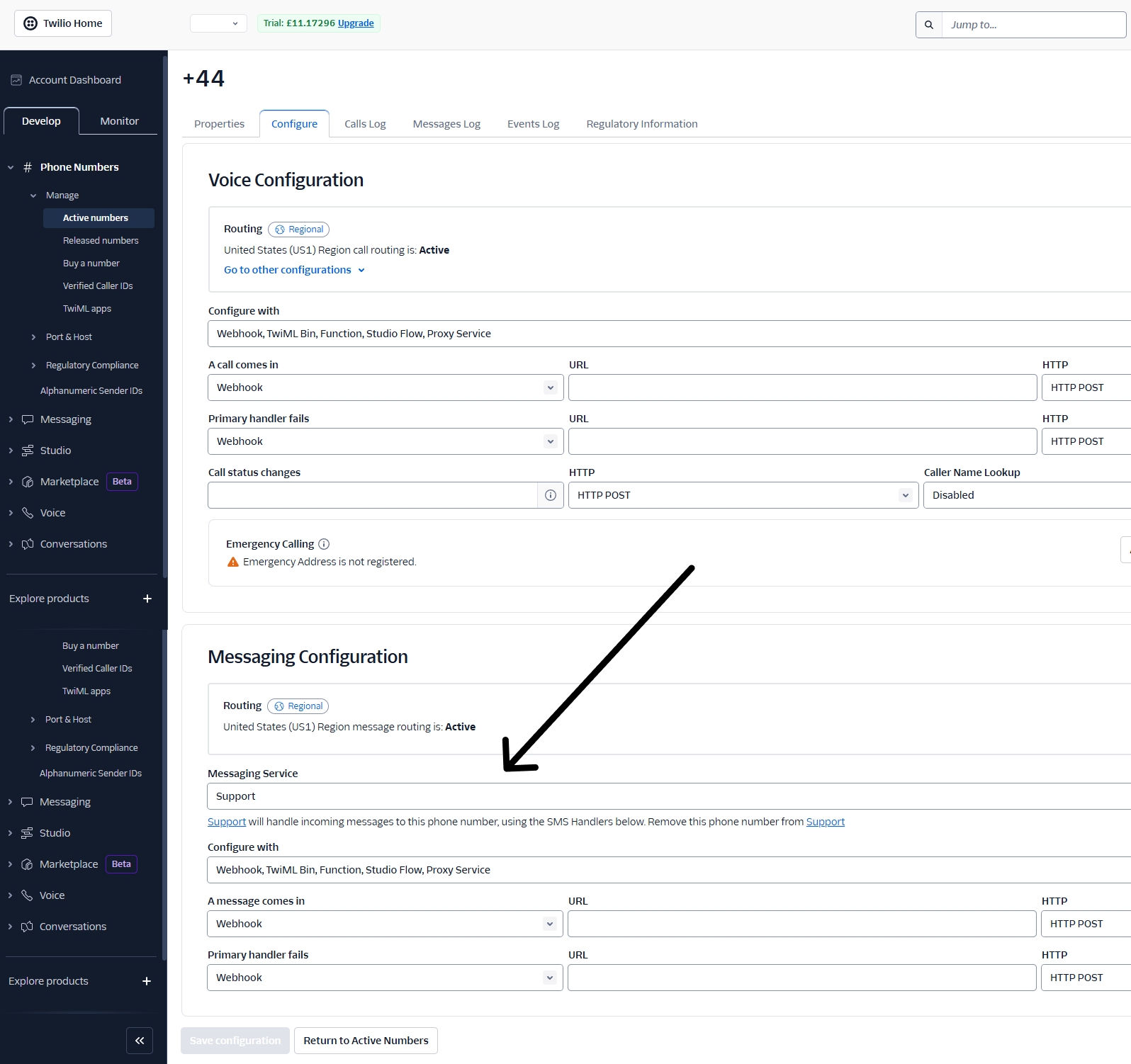 Under the Messaging Service tab you will be able to select the service you have created. Select the service and click Save at the bottom left side.