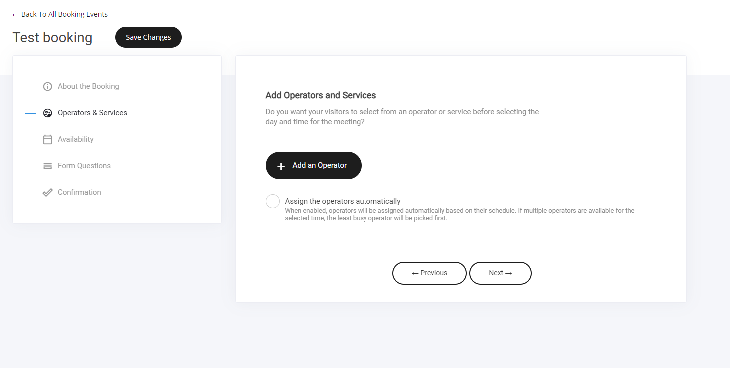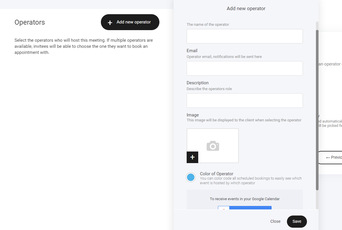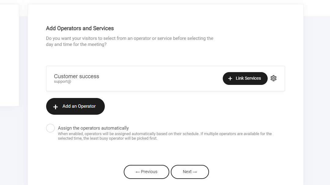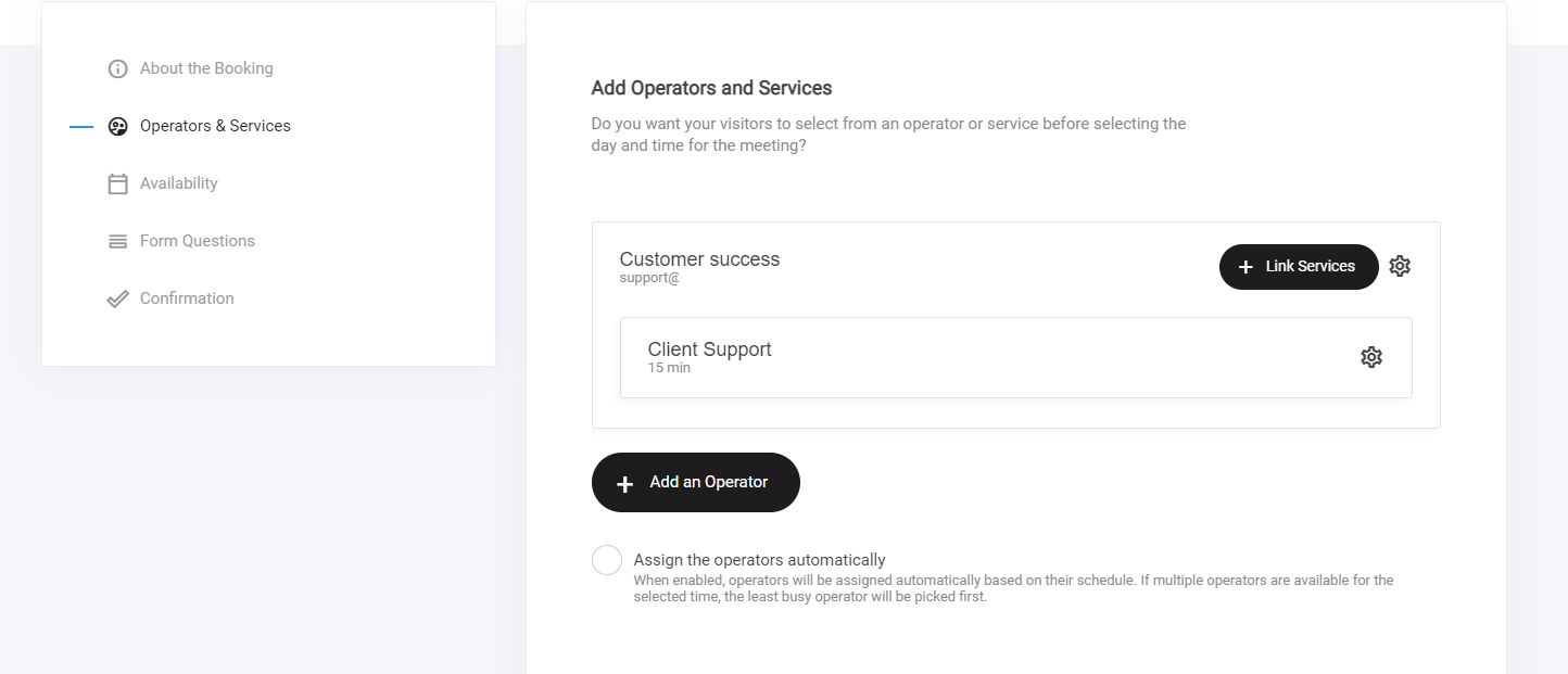 An operator is a person who will be conducting the meeting/event. Note: you can add multiple operators if required. Services are optional. For example a service would be different types of meetings or booking type like 2 booking services could be: 15 minute video call and in person meeting.