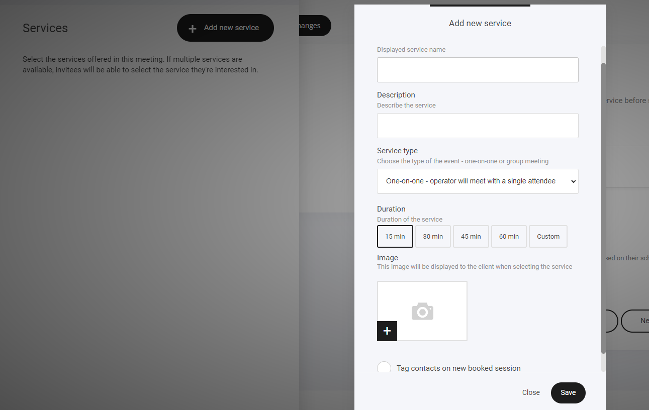 Fill out the required fields in the 'add new service popup' Also select if you want a one to one meeting or multiple people for example you are running an online webinar with only 50 spots available. Set your duration and you're done.