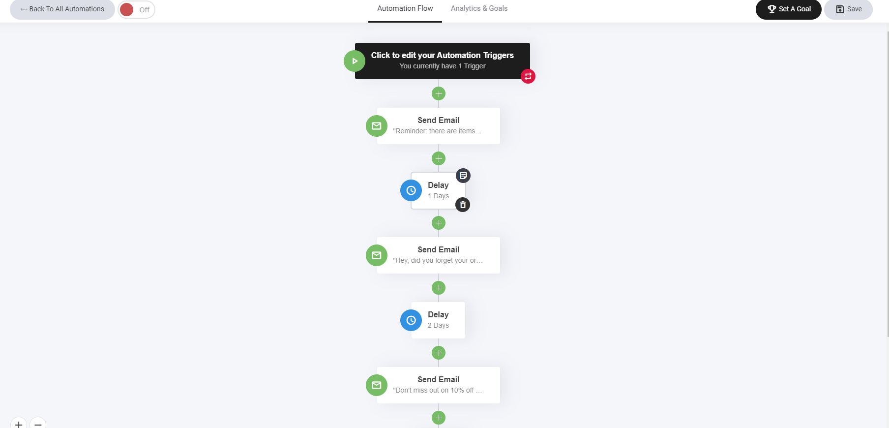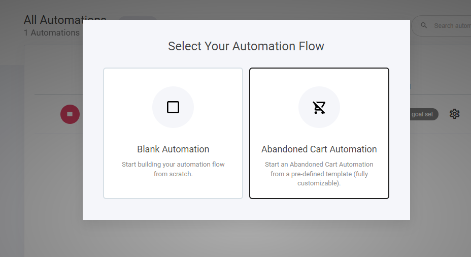The next step is to head in to the automations building. We have already set up a pre-built template for you. When you select create new automation tab, you will see this pop up appear. Here you need to select 'Abandoned cart automation' Once selected it will take you in to the automations flow.