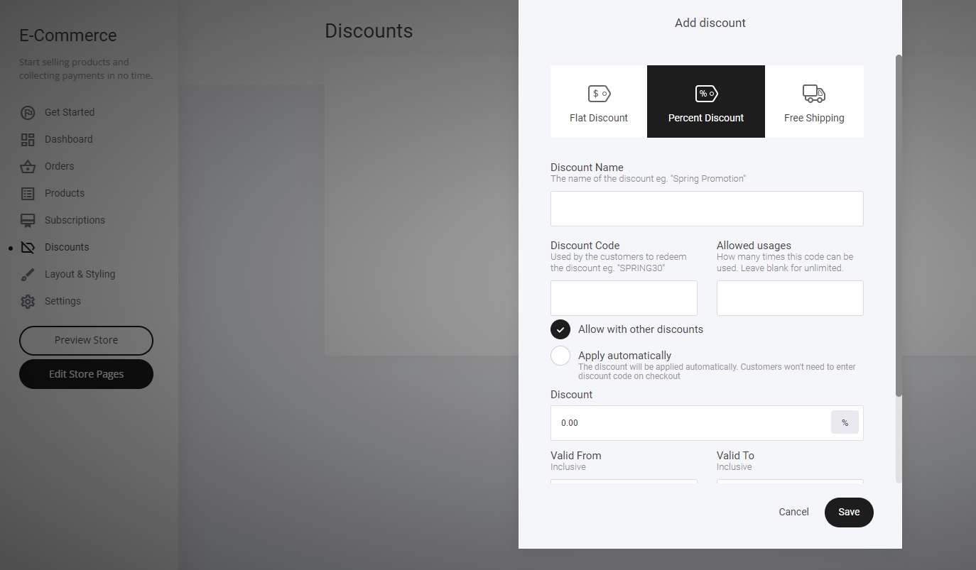 Boost sales and incentivize purchases with three types of discounts you can configure: