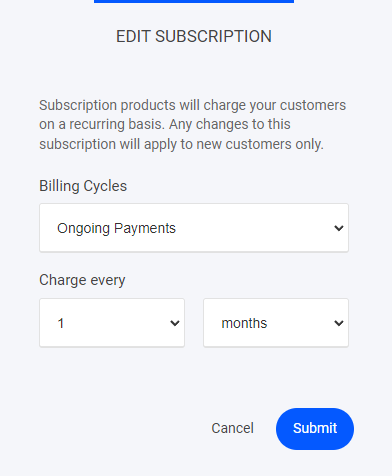 Subscription products will charge your customers on a recurring basis. Any changes to this subscription will apply to new customers only. Subscription payments can be configured to how ever you want to set them up:
