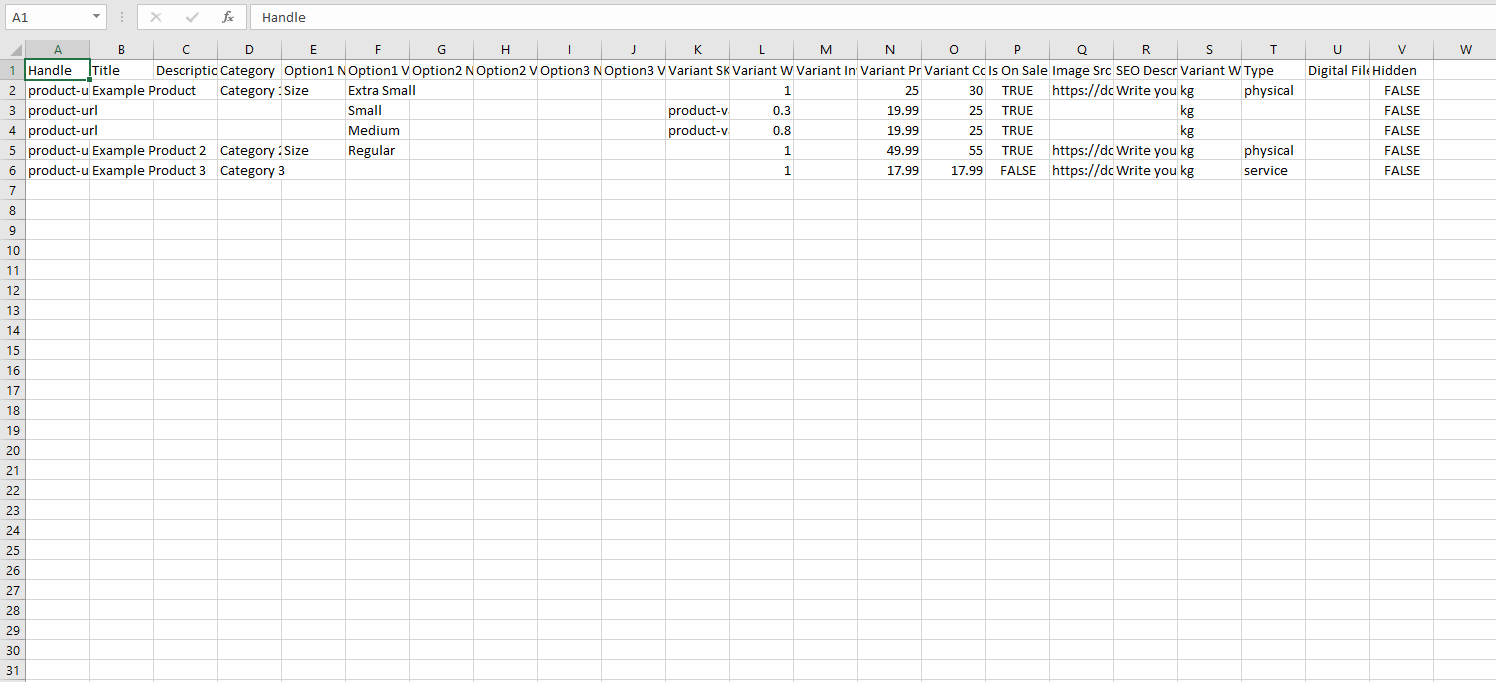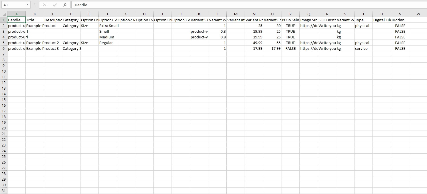 You can view and download an inventory CSV example for reference. It looks similar to the image below: You will be presented with a pop down menu to merge your existing parameters to start adding items to your store automatically.