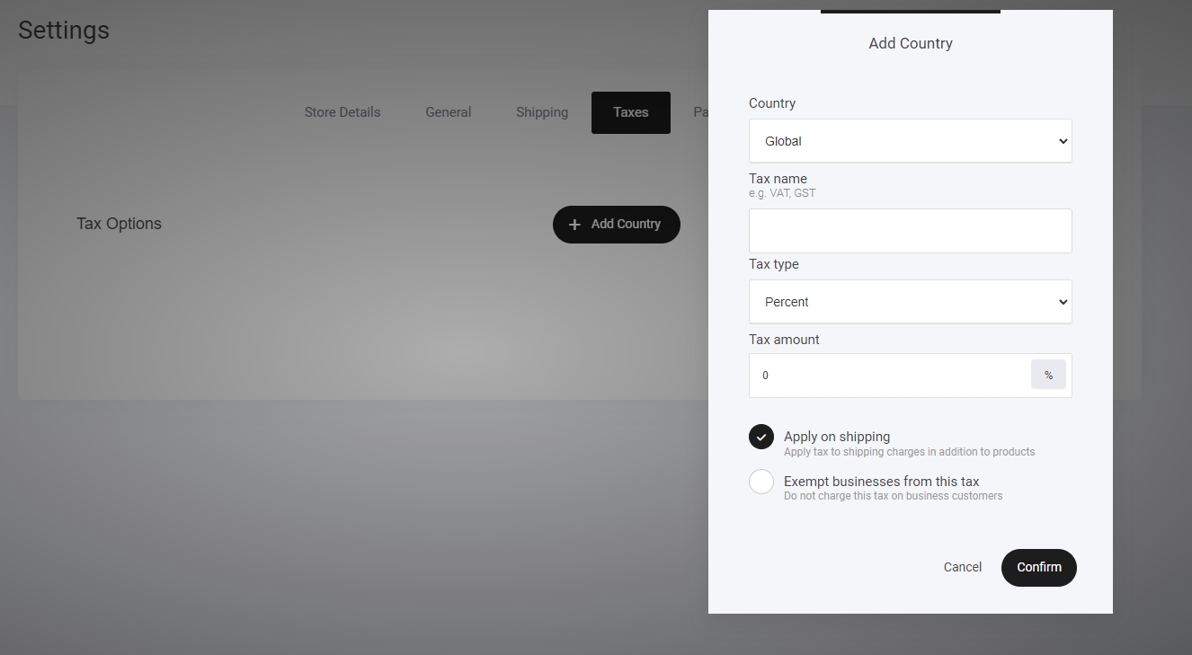 Click "Add Country" β Select the regions where tax rules need to apply.