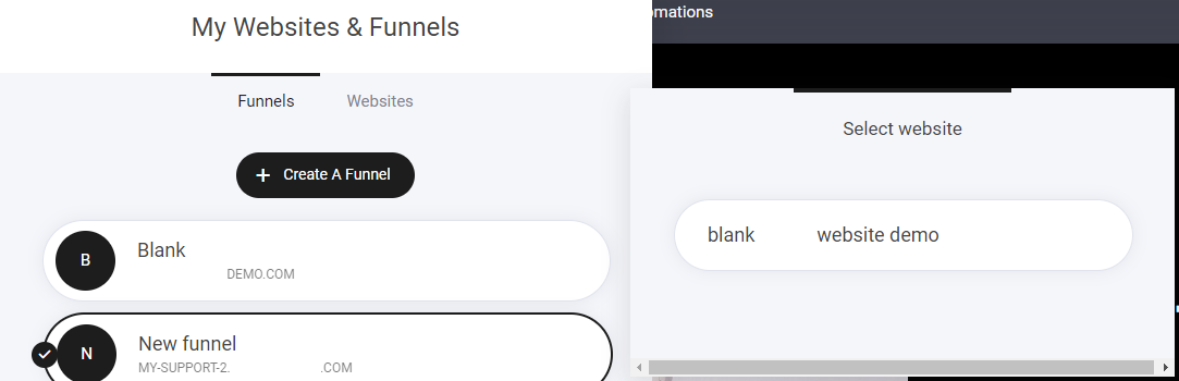Once selected a new window will display, this time select the website you want to add that funnel to: