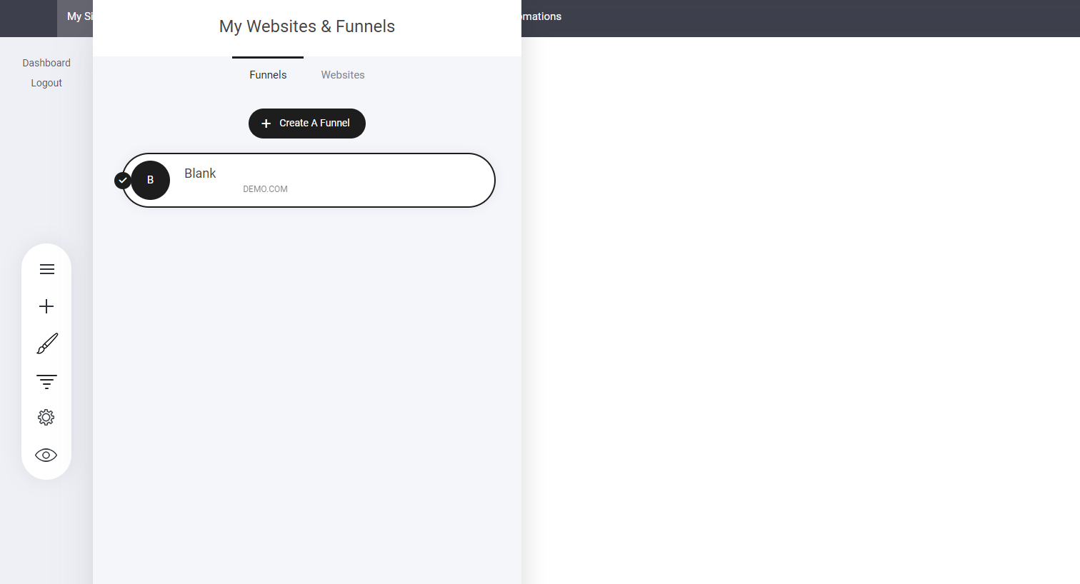 To view all your projects 'website and funnel' navigate to the My sites & Funnels tab located at the top of the builder dashboard. Once selected, a slide out containing all data will be displayed as shown below: