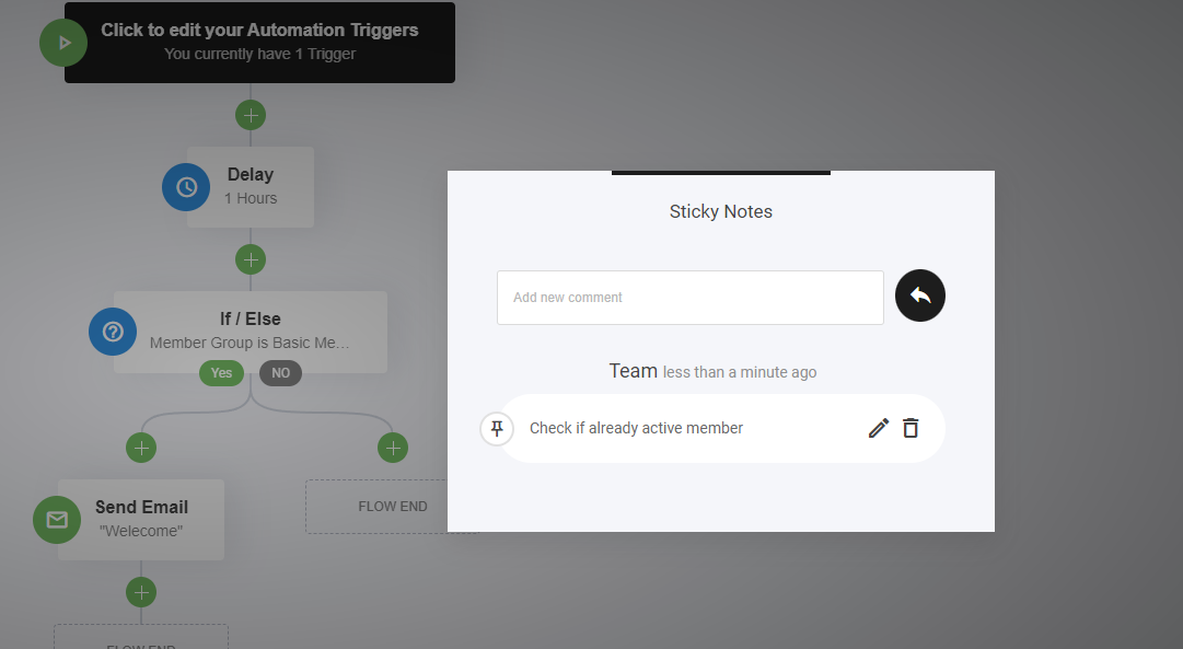 By selecting the notes function, you or your team members can leave helpful notes at each step of the automation funnel. This can be really helpful, to remind you of the step information, or simply adding instructions for your team to complete. Write it, save it, pin it.