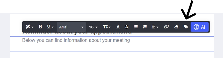 To add any further fields to the system email template you can do so by selecting the text editor when typing and click the Tag icon. The tag icon will then display the specific fields you can add to the system template as shown below.