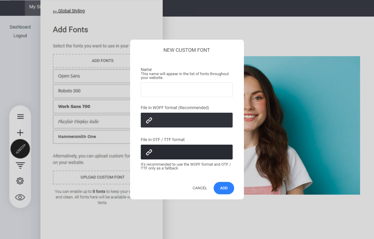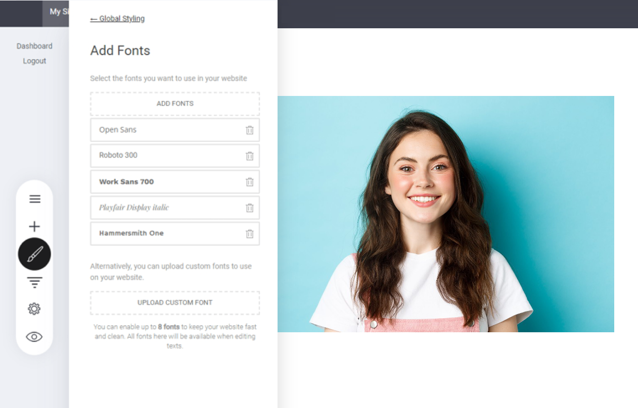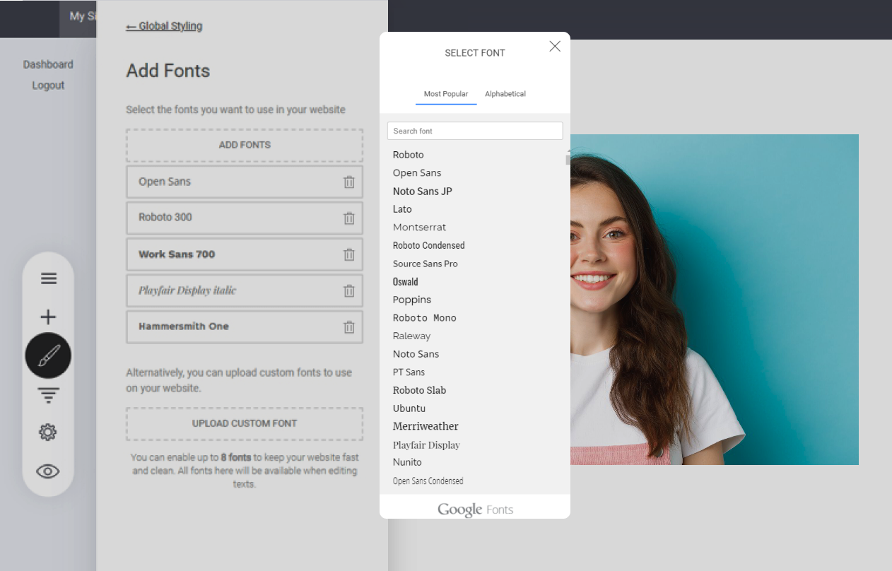 Selecting a new font opens the Google font list with over 1,000 font options. You can use up to 8 fonts at once. We recommend using no more than 3 fonts to maintain branding consistency, readability, and optimal site performance.