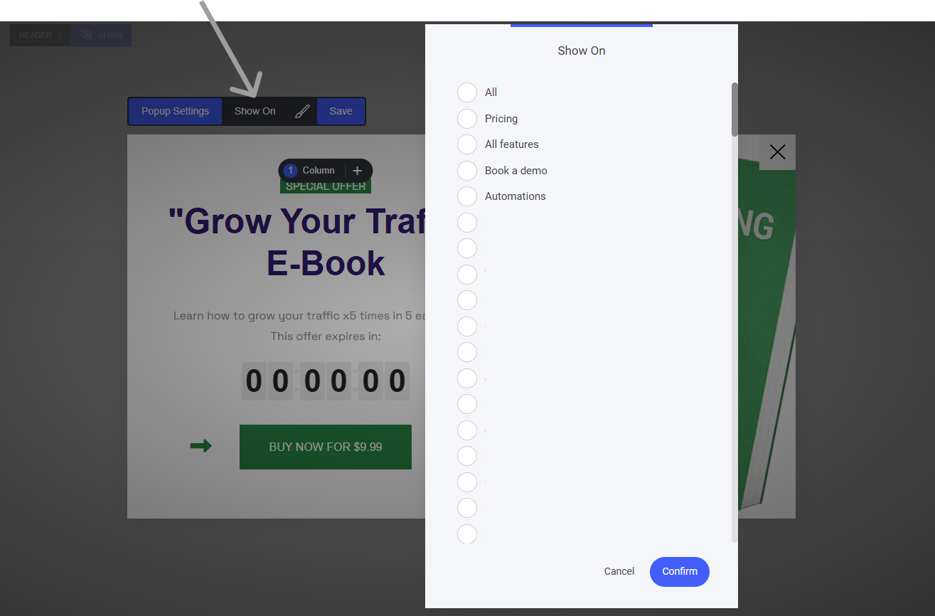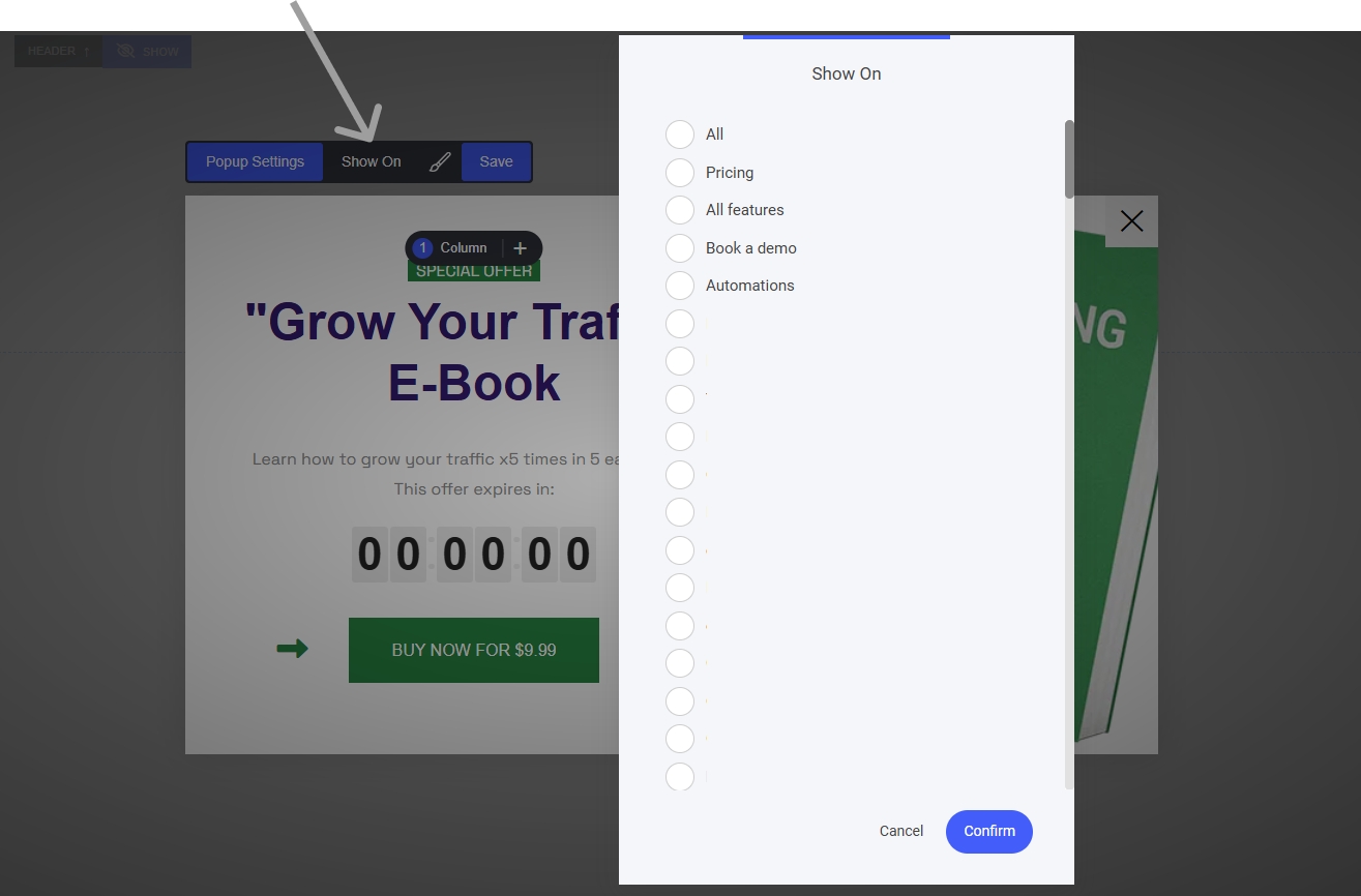 To select on what page of your website a popup should show, open the popup and select the "Show On" option. Here you can select on what page your popup will display.