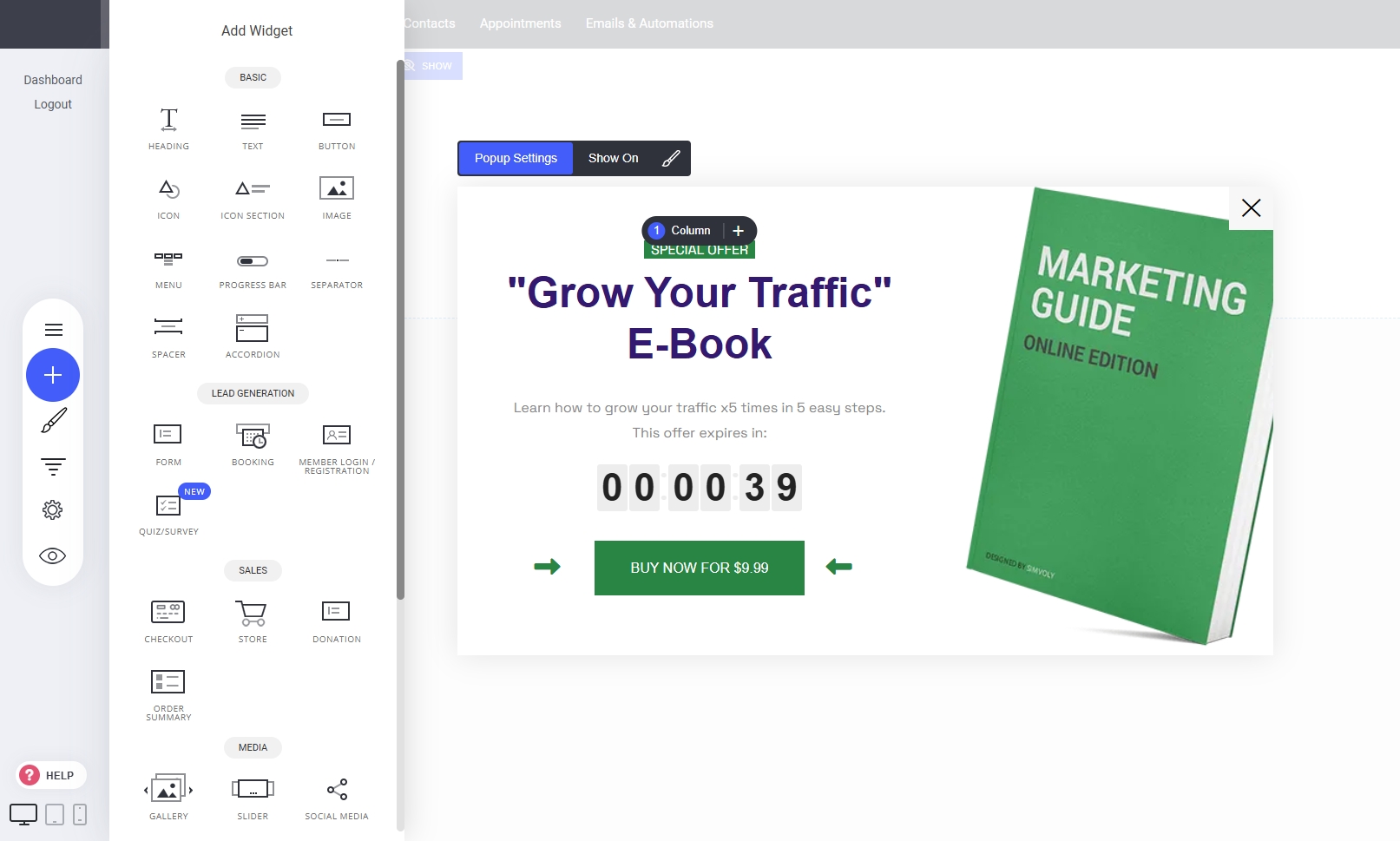 Any widget, regardless of its type, is fully draggable into a popup interface. Once moved into the popup, the widget retains all its functionalities, ensuring that it can be modified, rearranged, and customized just as it would be within the standard page builder environment.