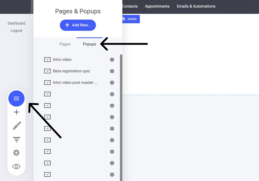 Select "Popups" – This will display all previously created popups for editing or activation.