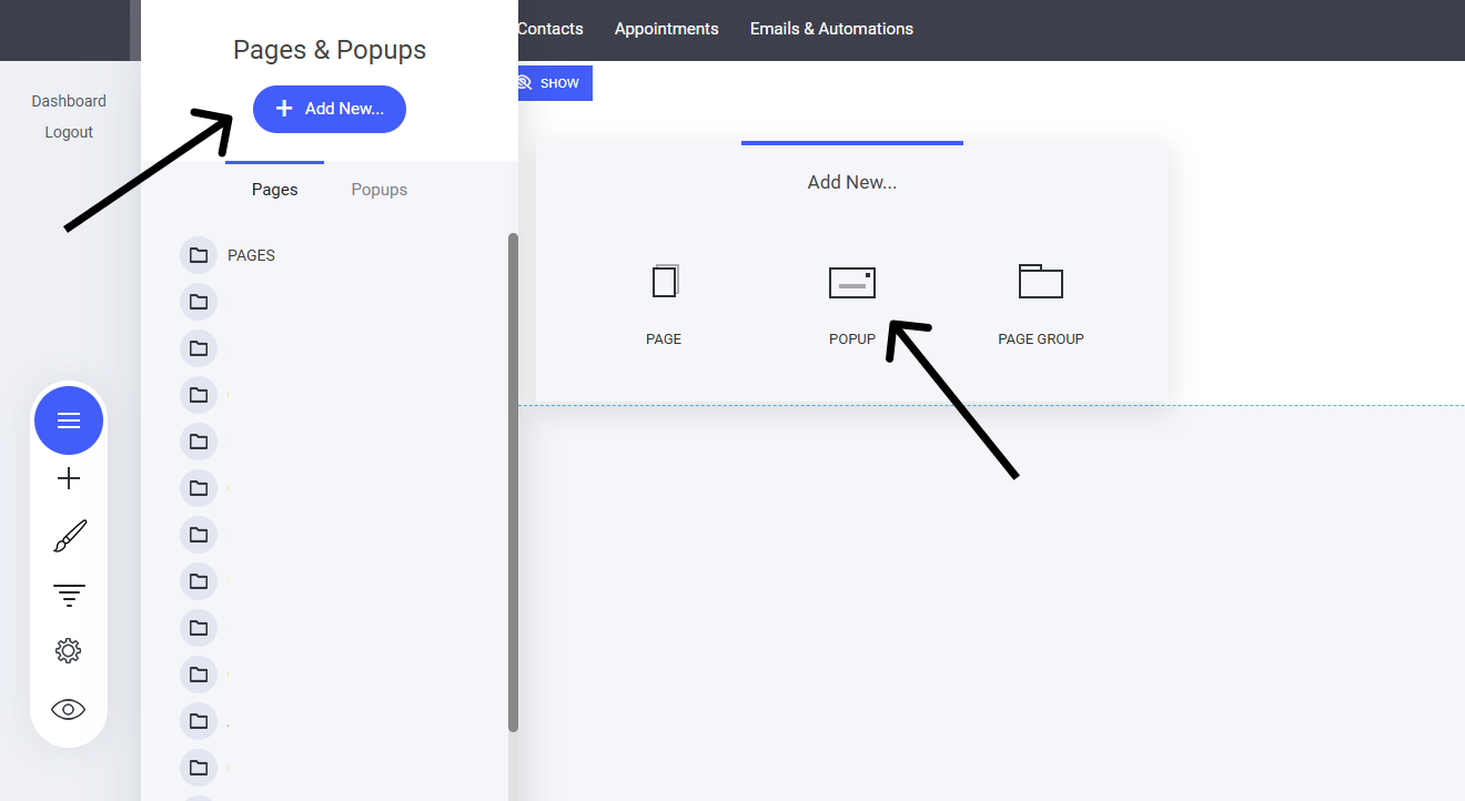 Go to Pages – Access the Pages & Popups section.
