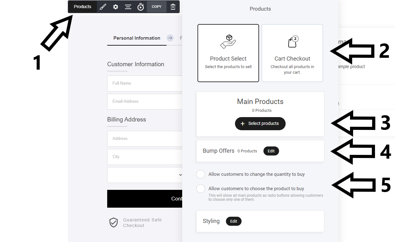 Here you have 2 options. Product select or cart checkout. Product select means the product or products you want to add to that specific checkout widget. Cart checkout means: If you have a previous page where users can add products to a cart and you want them to go to another page after adding items to their cart, for example in funnels this is a great option.