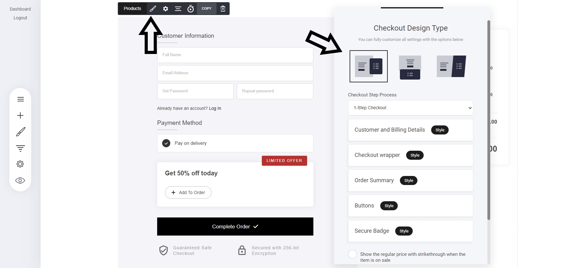 Checkout style: Currently there are 3 checkout style options to chose from as highlight in the image above.