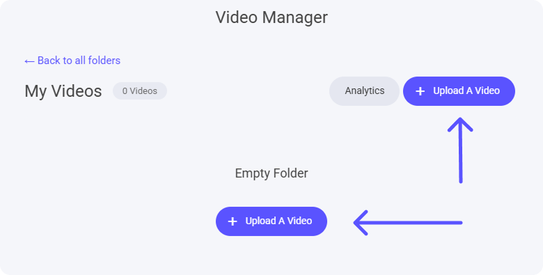 Let's open the folder we have just created called 'My Videos' in here you'll be able to upload your video content. Click any of the +Upload A Video tabs to start.