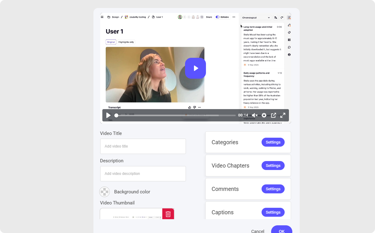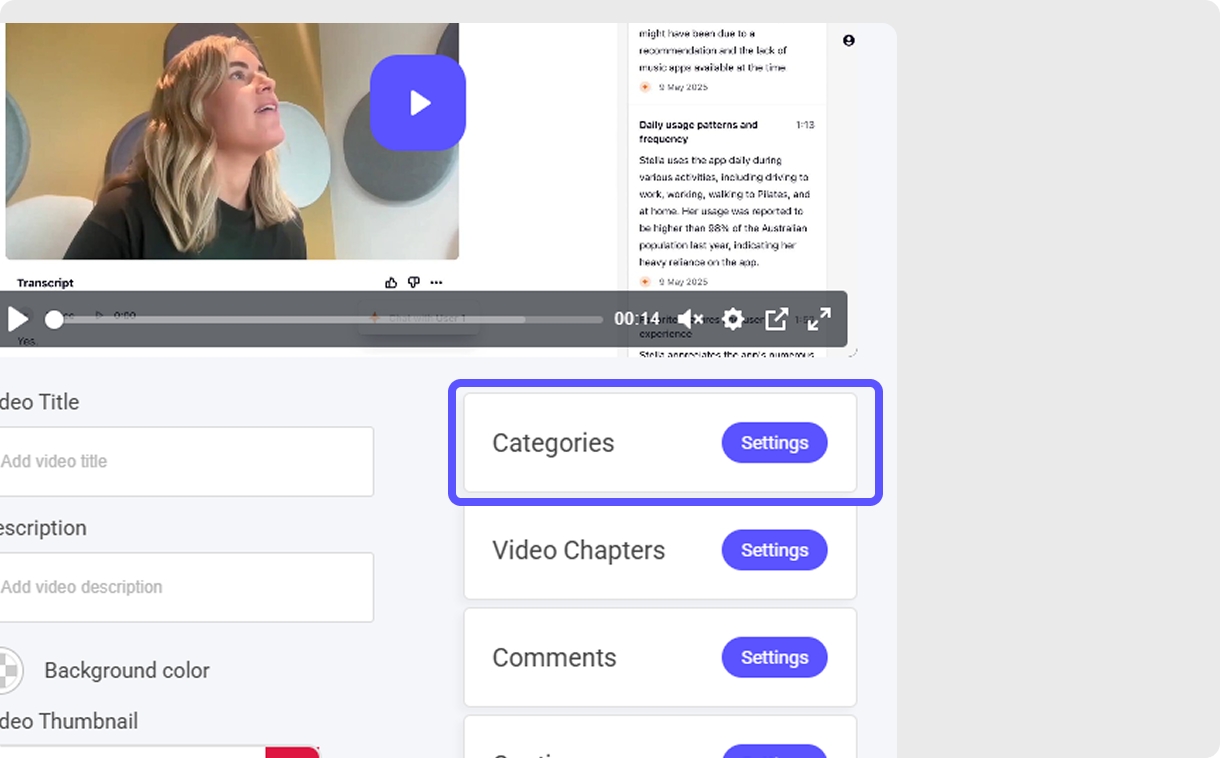 A video thumbnail is the preview image that represents your video before it’s played. You can upload a custom thumbnail to make the video more visually appealing and recognizable.