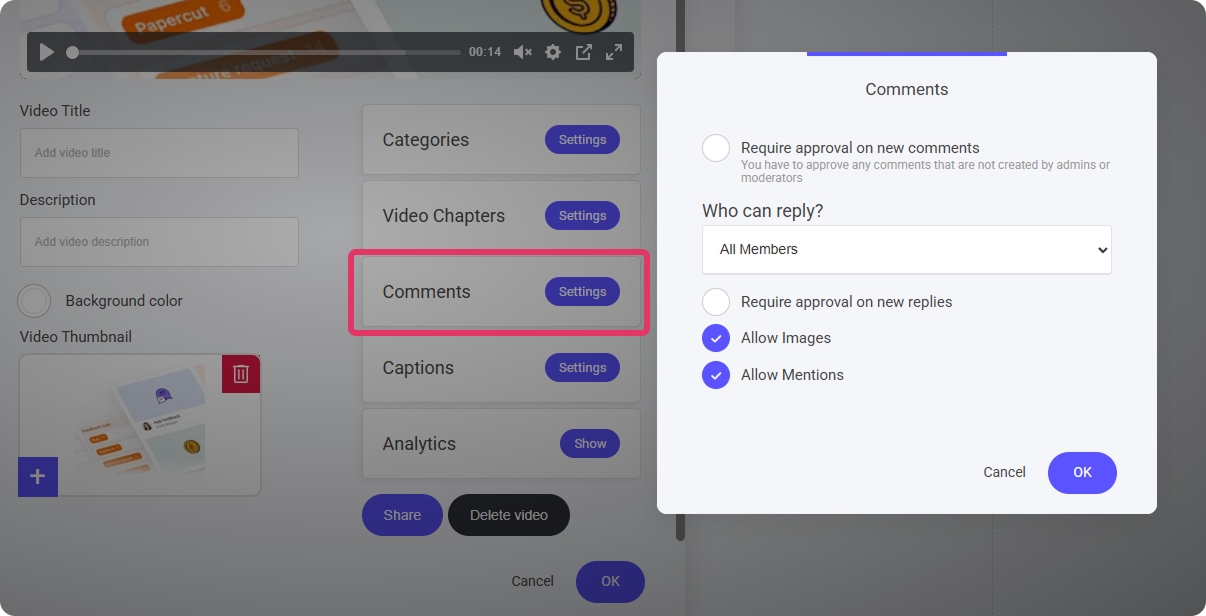 Note: You can enable and disable comments when adding your videos to a page and also a playlist.