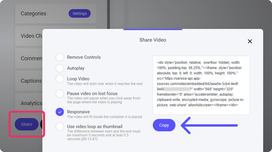Copy the embed script—paste it into your website, emails, or other platforms that allow embedded videos.