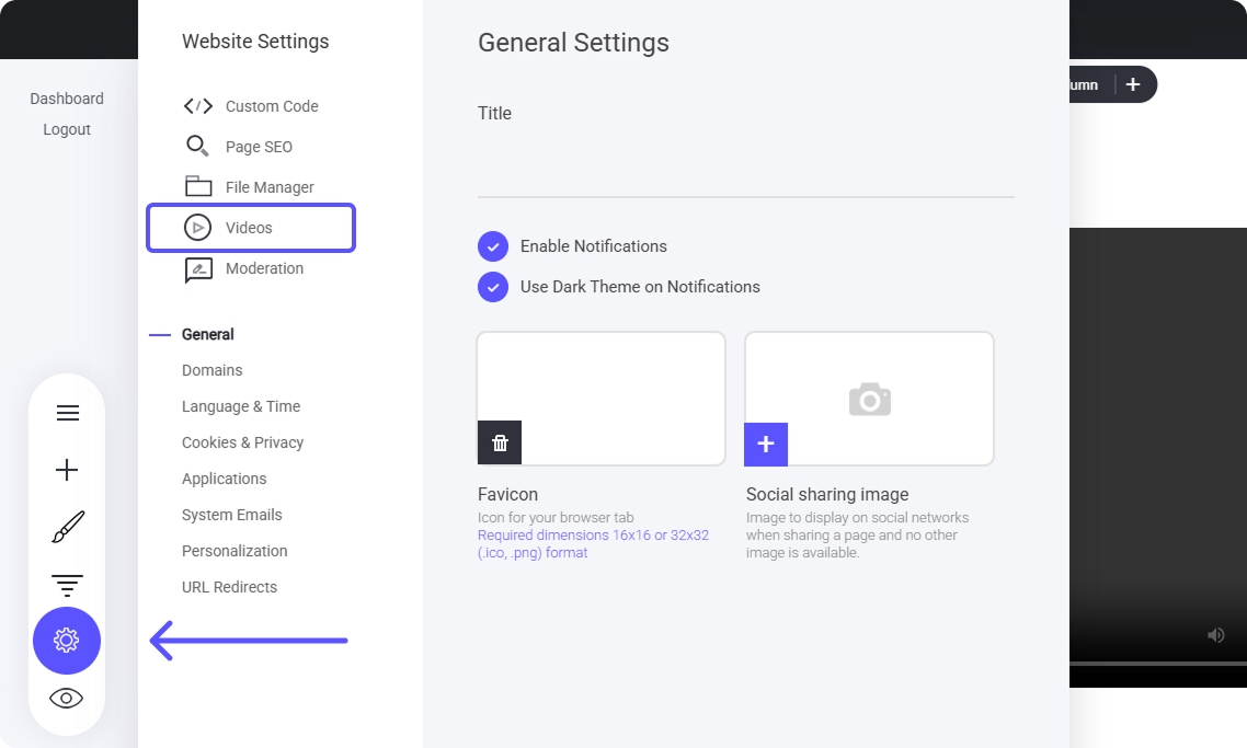 To upload a video, navigate to the left hand side task bar and select the website settings 'Cog icon' Next, select the Videos tab located towards the top.